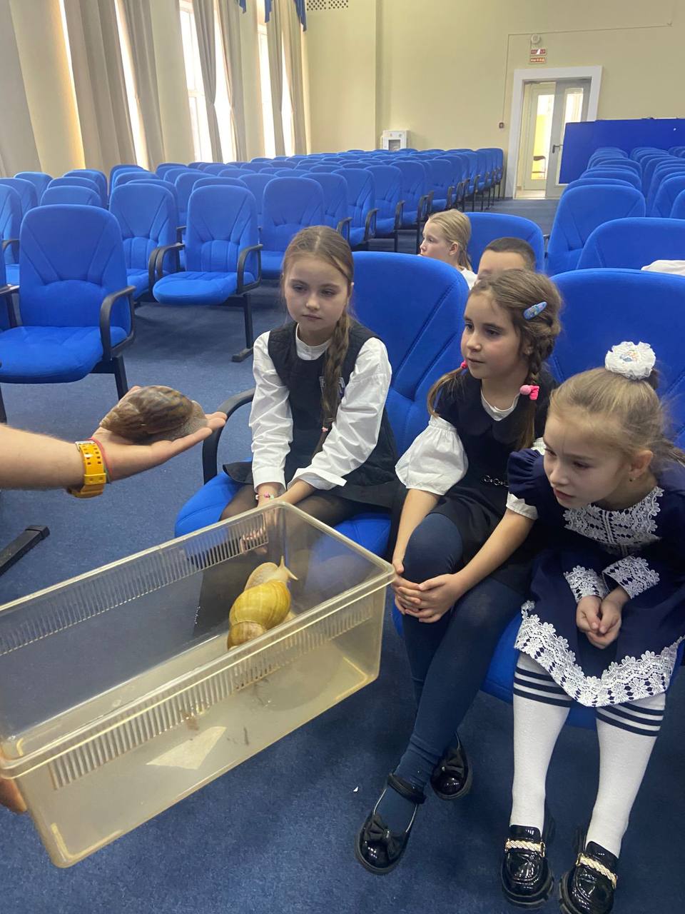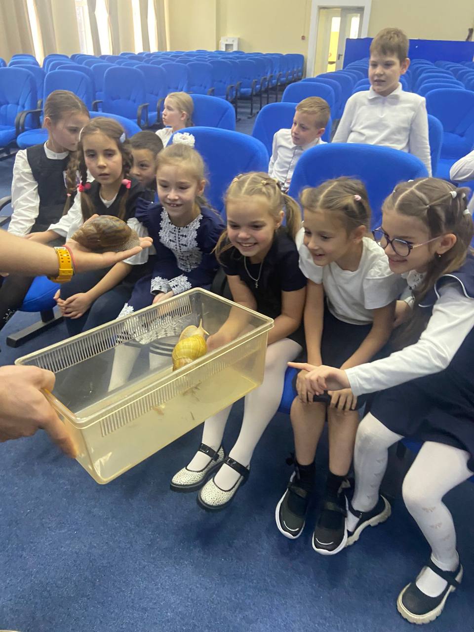 Ребята познакомились с самым зубастым обитателем нашей планеты. И это оказалась не акула или крокодил, как предполагали дети, а виноградная улитка Василиса, у которой 25000 зубов!