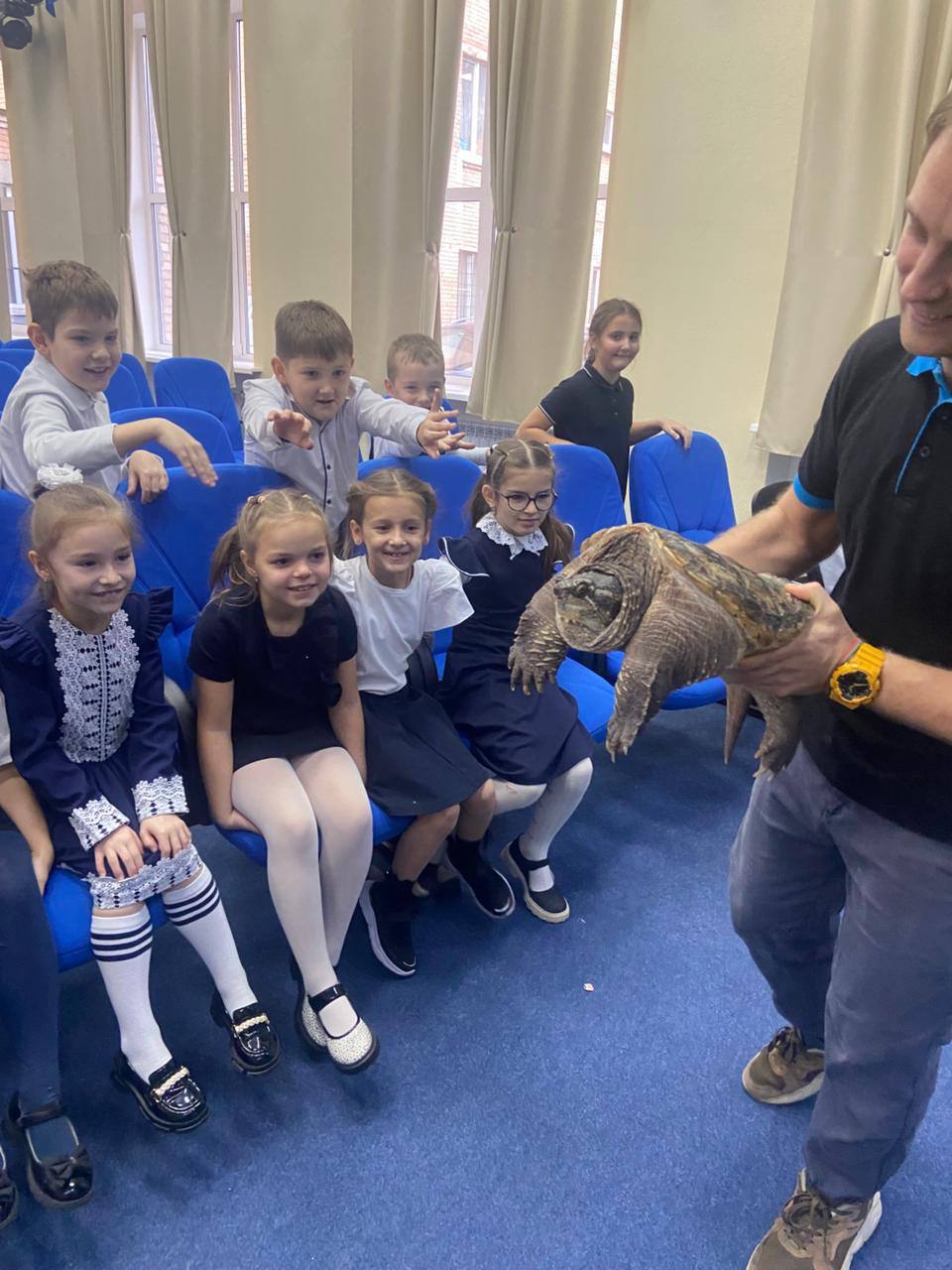 Одним из гостей нашей школы в этот раз стала кайманова черепаха - долгожитель Борис, панцирь которой это сросшиеся за время эволюции ребра.