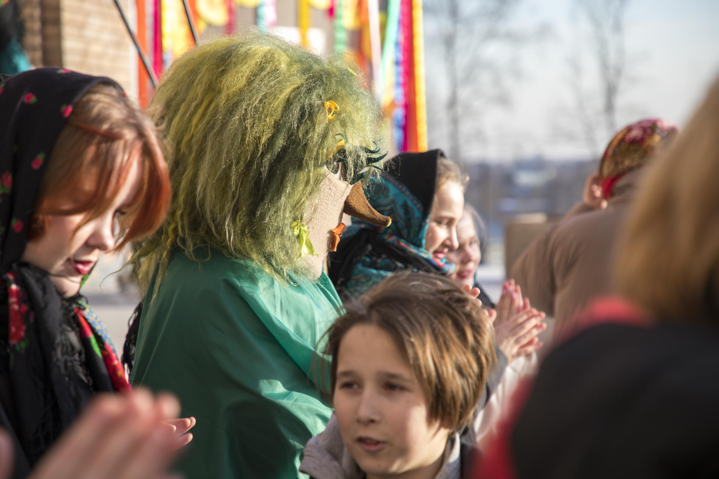 Ребят порадовали сказочные персонажи: Матрена, царь Горох, а также скоморохи, Медведь и Кикимора, которые развлекали публику веселыми играми и смогли взять себе в невесты Весну.
