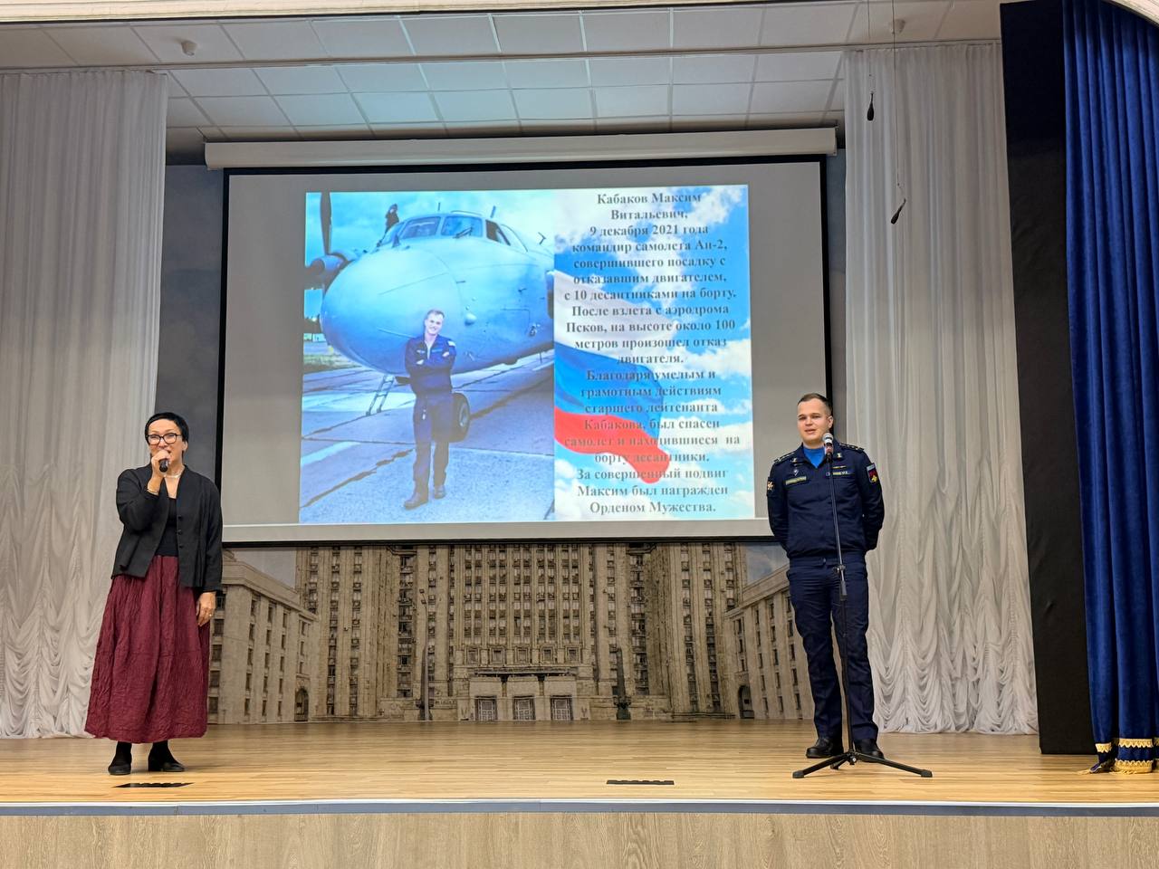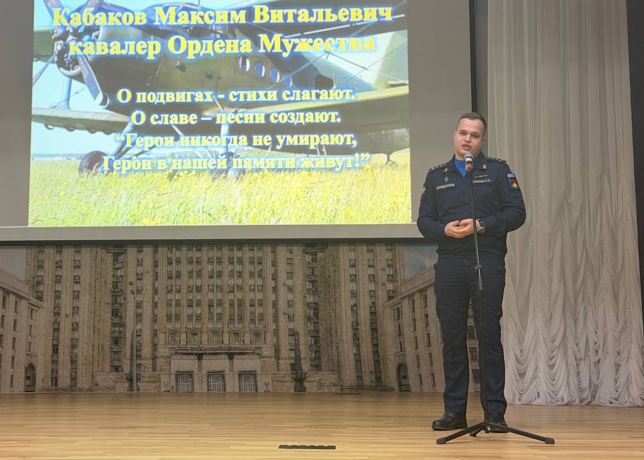 Учащимся показали видеоролик о событиях 9 декабря 2021 года, когда у самолёта с десантниками на борту отказал двигатель на высоте более 100 метров. Командир экипажа Максим Кабаков совершил вынужденную посадку, сохранив жизни всех десяти человек на борту.