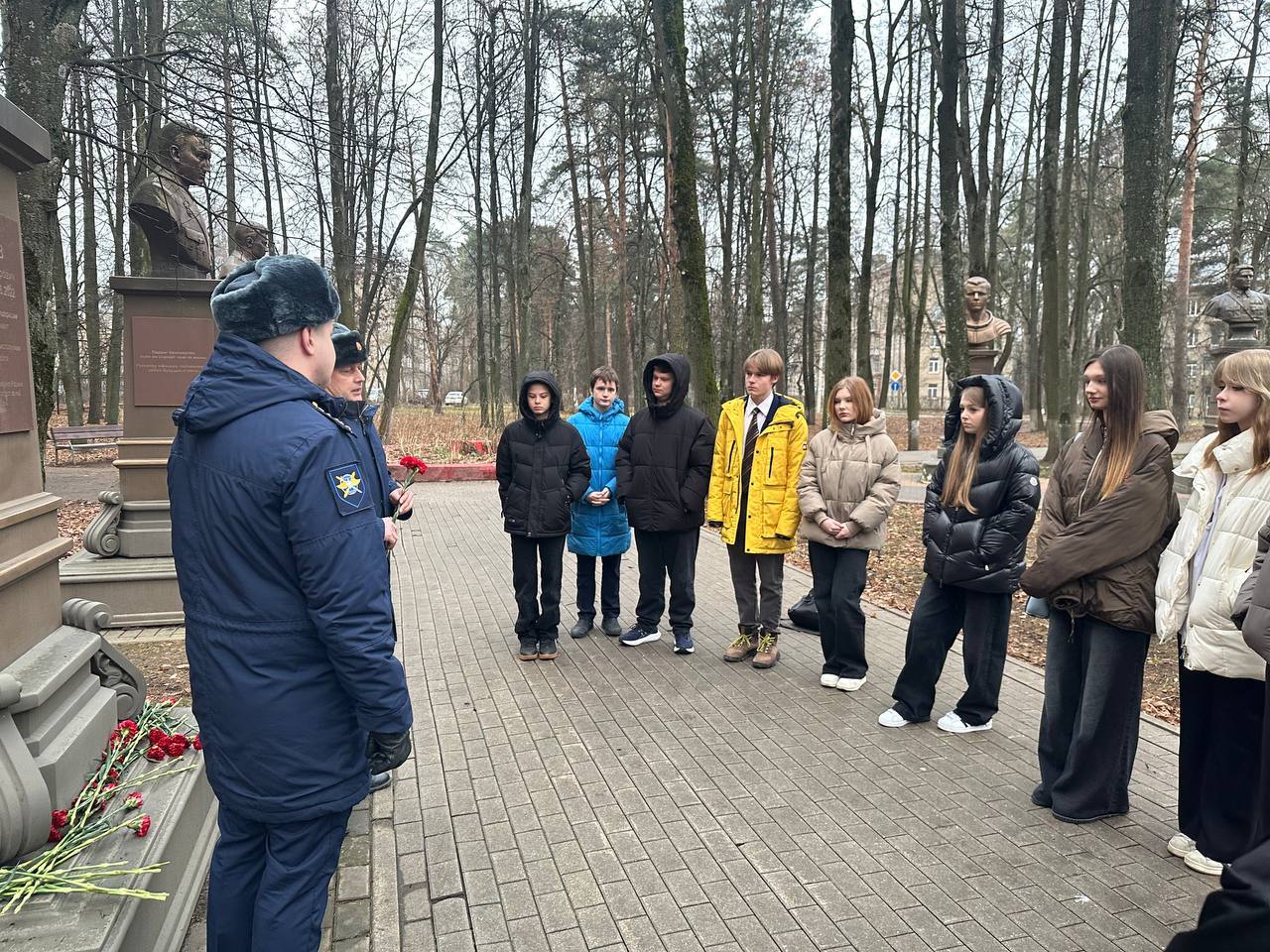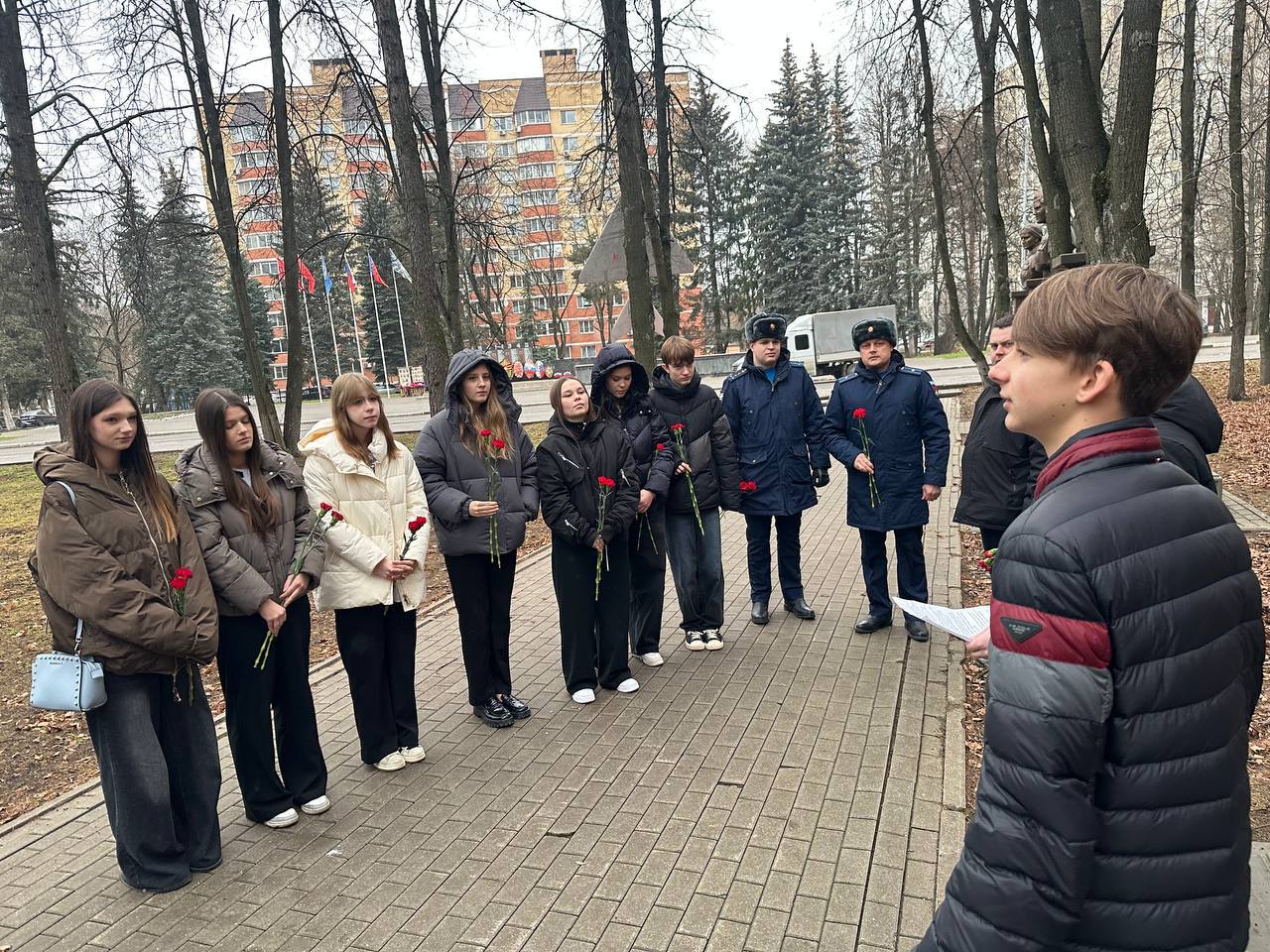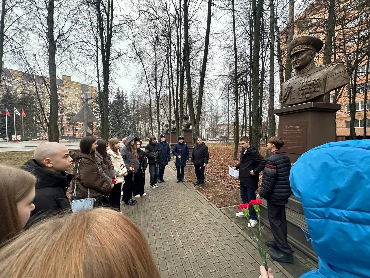 Затем группа учащихся, педагоги и гость приняли участие во Всероссийской акции #Спасибо_Героям. Все вместе они возложили цветы к памятнику генерал-лейтенанта Романа Владимировича Кутузова, геройски погибшего при исполнении воинского долга.