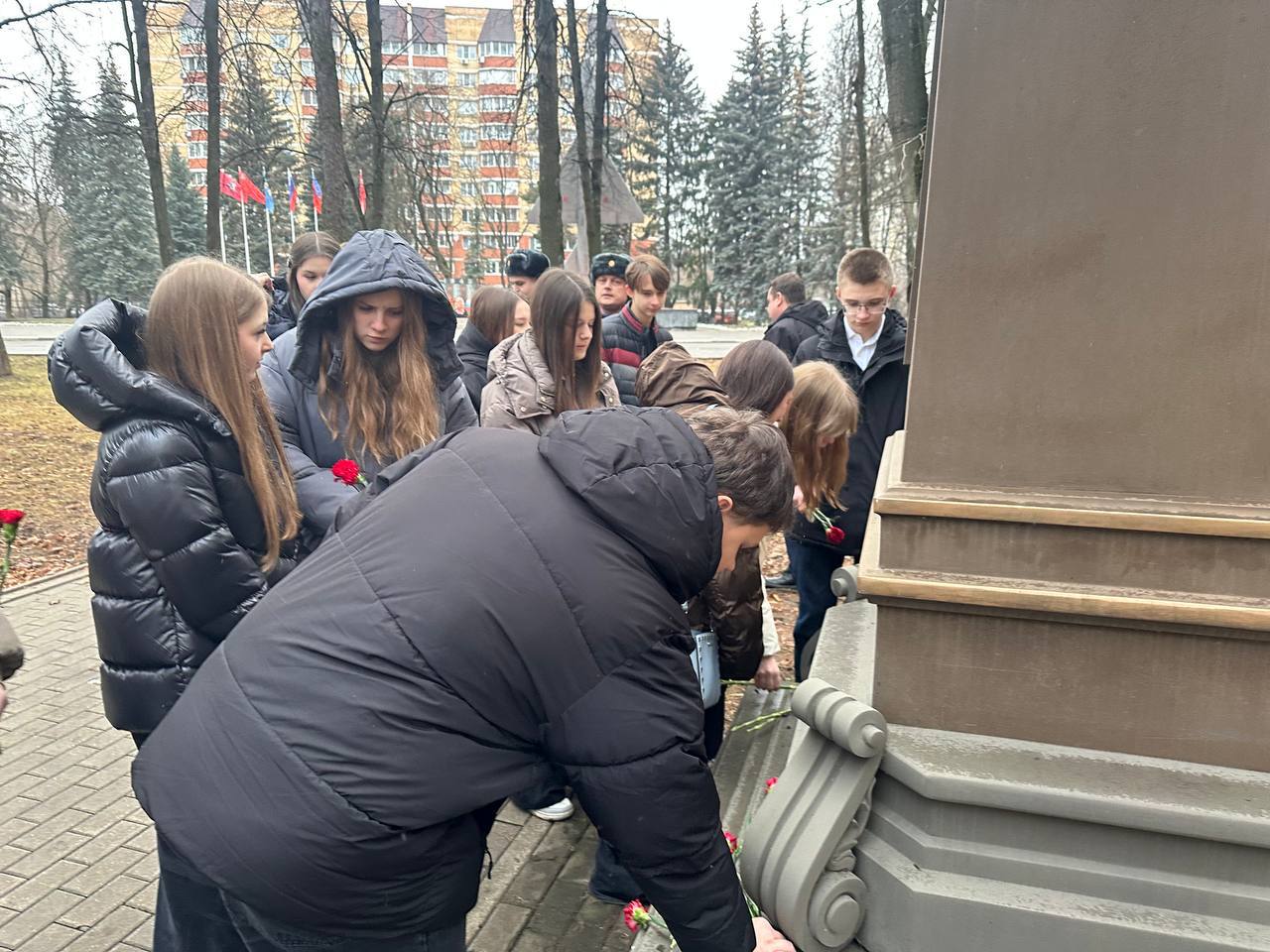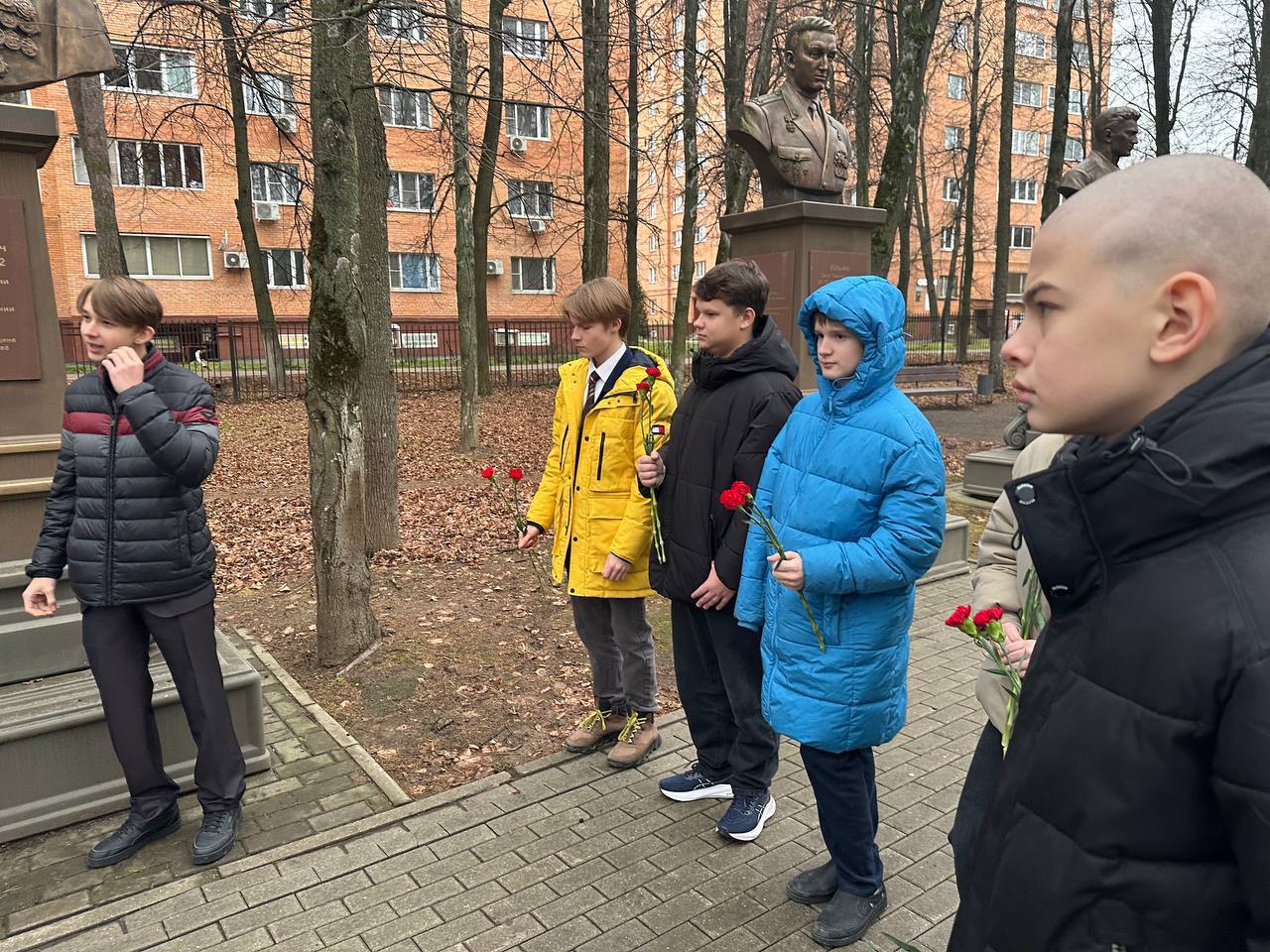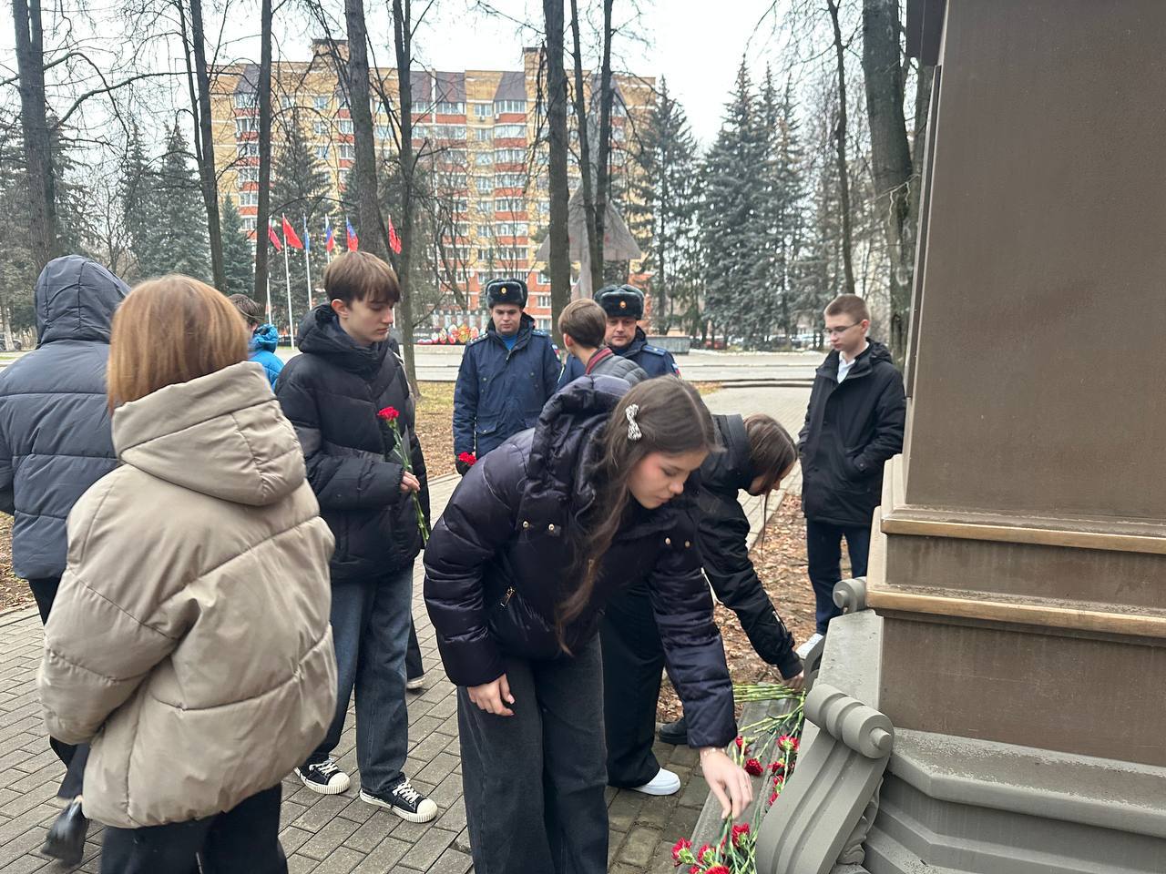 Затем группа учащихся, педагоги и гость приняли участие во Всероссийской акции #Спасибо_Героям. Все вместе они возложили цветы к памятнику генерал-лейтенанта Романа Владимировича Кутузова, геройски погибшего при исполнении воинского долга.