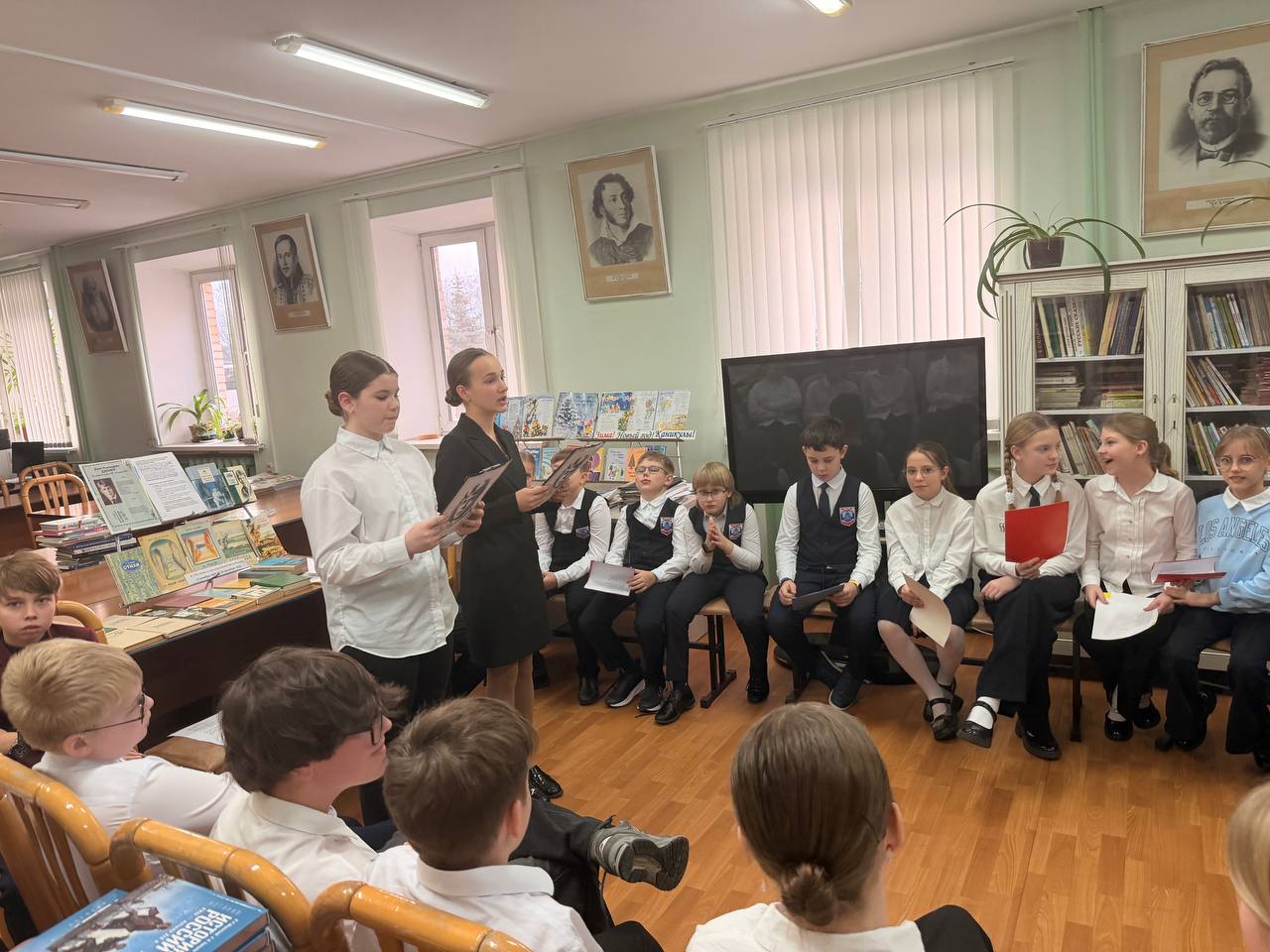 В школьной библиотеке библиотекарь Крылова Ольга Дмитриевна оформила красочный тематический стенд и книжную выставку. Здесь же для учеников 4-б и 5-б классов состоялся литературный классный час «Поэтическая осень». Его подготовили и провели ребята из 7-б класса. Они рассказали младшим школьникам о детстве Есенина, о том, как семья, родная природа и крестьянский быт повлияли на его творчество. В ходе встречи прозвучало 16 стихотворений поэта.